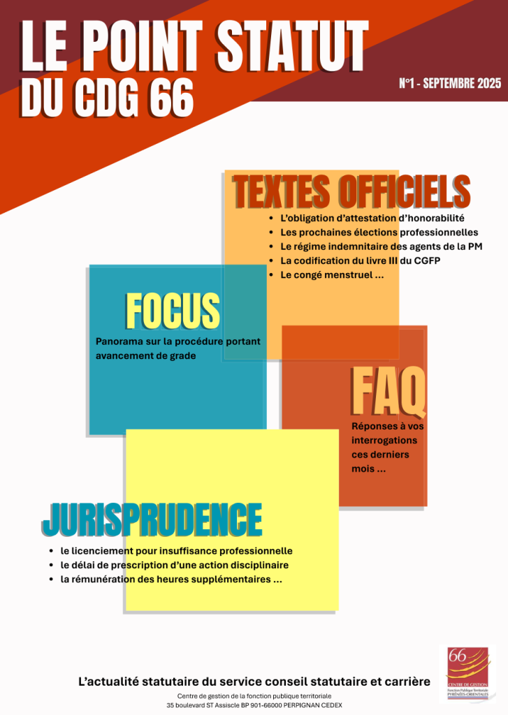 Le service conseil statutaire et carrière du Centre de Gestion 66 met à votre disposition « Le point Statut du CDG 66 ».Cette publication vous propose une veille juridique ciblée comprenant :Une sélection des textes officiels récemment parus,Des éléments de jurisprudence pertinents,Un focus sur un point d’actualité statutaire ou juridique,Une FAQ regroupant les réponses aux questions les plus fréquemment posées au service